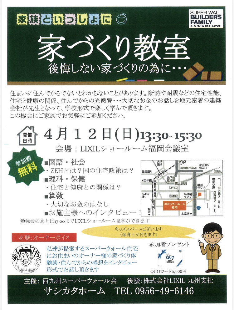 NEWS お知らせ 2026/03/25 家づくり教室開催 リクシル 西九州SW会 家づくり教室(要予約) 住宅と健康~お金の話まで とっても為になるお話会です。 お子さま連れでもOK! 保育士がつきます。 ご予約の際に、お子様の年齢、性別お知らせ下さい。 ※参加者にはQUOカード5,000円分プレゼント!【場所】LIXIL ショールーム 福岡会議室福岡県福岡市博多区半道橋2丁目15-10【日時】2026年4月12日(日)13:30~15:30 一覧へ戻る